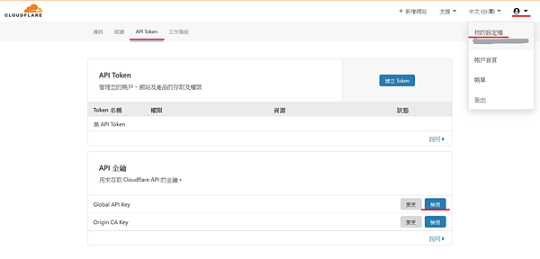 - 先到 Cloudflare > 右上角我的設定檔 > API Token > Global API Key > 檢視 取得 token